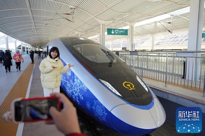 1月6日,在京張高鐵太子城站,一位記者在G9981次北京冬奧列車車廂前合影。新華社記者鞠煥宗攝