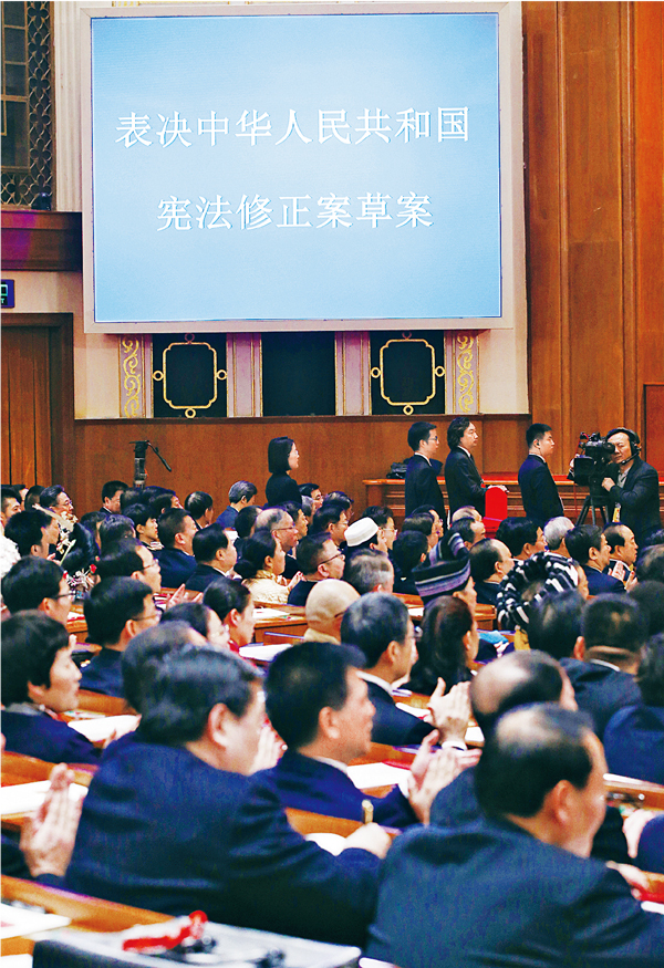 2018年3月11日,十三屆全國人大一次會議在北京人民大會堂舉行第三次全體會議,通過了《中華人民共和國憲法修正案》,將“中國共產黨領導是中國特色社會主義最本質的特征”寫入憲法。圖為投票表決的現場。 新華社記者 姚大偉/攝