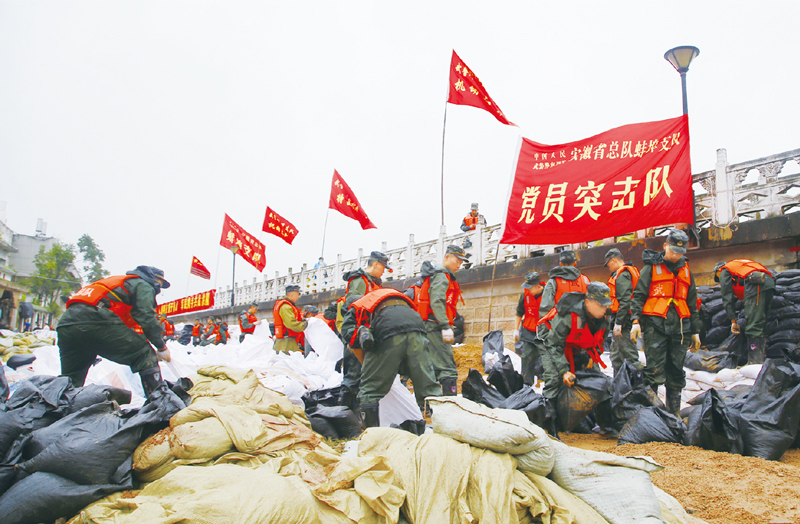對黨忠誠、聽黨指揮、為黨盡責,各級黨組織充分發揮戰斗堡壘作用。圖為2020年7月16日,武警安徽總隊蚌埠支隊125名黨員組成突擊隊在銅陵市樅陽縣長河上碼頭搶運沙袋,加固堤壩。 新華社發 李程輝/攝