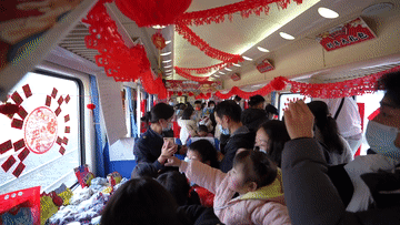 每逢年貨鋪開張,紅燈籠、中國(guó)結(jié)高掛車廂兩端,與車窗上的春聯(lián)福字相互襯托,火車內(nèi)部洋溢著濃濃的年味。