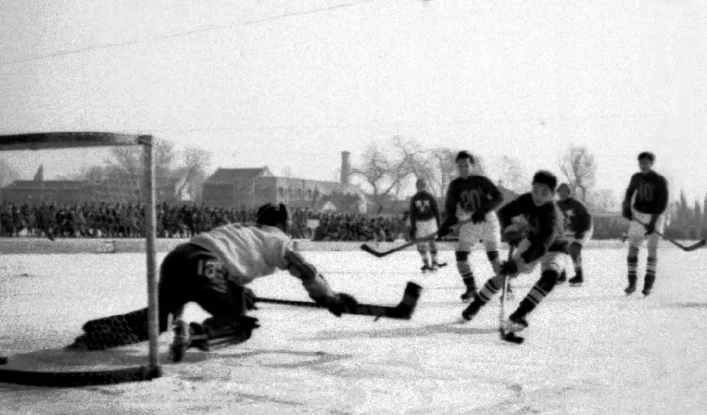 1953年,華北區(qū)冰上運動會,北京隊與天津隊的冰球比賽。(圖源:人民畫報)