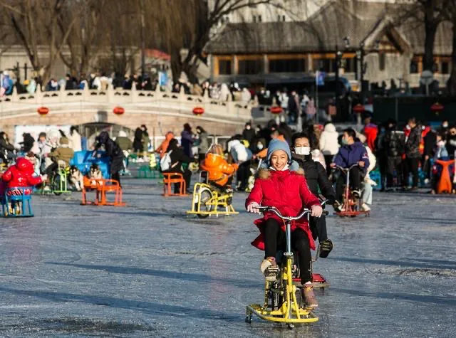 今年1月,什剎海冰場如期開放。冬日的陽光灑在冰面上。小組看到,除了滑冰,這里還有冰上自行車、冰車小海豹、冰上碰碰車等娛樂設(shè)施,儼然一個老幼皆宜的大型游樂場。