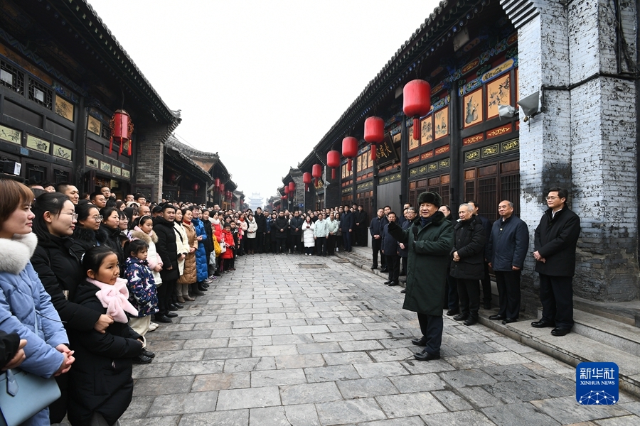 1月26日至27日,中共中央總書記、國家主席、中央軍委主席習近平來到山西,看望慰問基層干部群眾。這是26日下午,習近平在臨汾市汾西縣僧念鎮段村文化廣場,給鄉親們拜年,向全國各族人民、向港澳臺同胞和海外僑胞致以美好的新春祝福。新華社記者 李學仁 攝