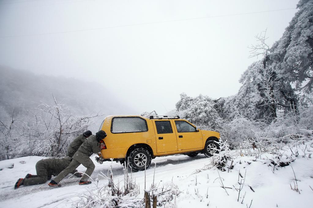 車(chē)輛打滑,輸電運(yùn)檢人員不得不推車(chē)上坡。(受訪(fǎng)者供圖)