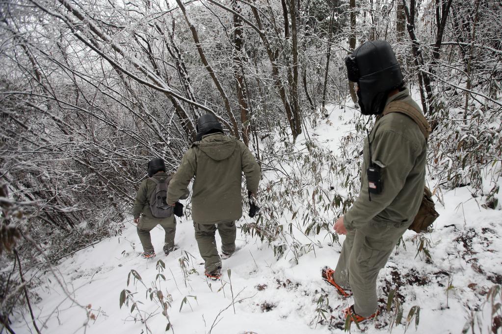 冰雪覆蓋的山林格外安靜,三人從鄉(xiāng)村公路走到林間小路,雪越來(lái)越厚,林越來(lái)越密。韓永璞拿著鐮刀,砍著攔路樹(shù)枝,在密林里鉆了10多分鐘,終于到達(dá)山頂?shù)牡?6號(hào)鐵塔。