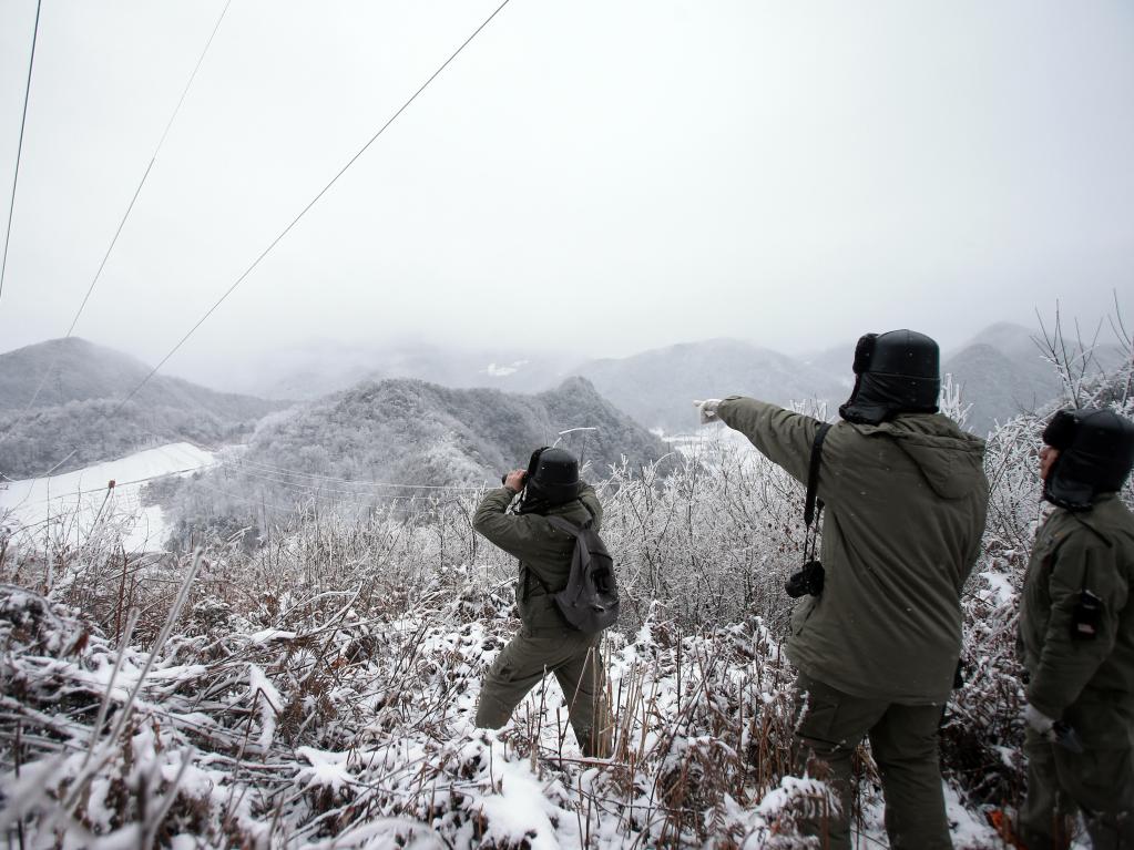 “導(dǎo)線(xiàn)有覆冰,架空地線(xiàn)也有。如果地線(xiàn)覆冰太厚,可能會(huì)造成短路。”韓永璞三人一邊拍照記錄,一邊將情況向后方匯報(bào)。