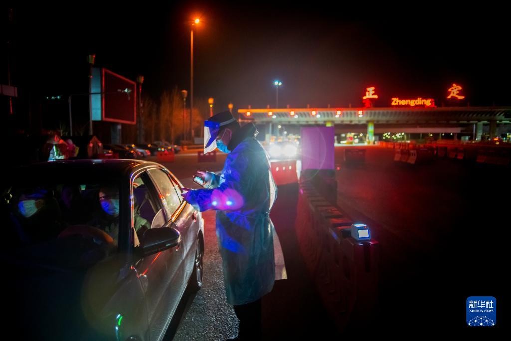 1月31日,除夕之夜,河北省石家莊市正定縣公安干警為外地回鄉人員核查健康碼、行程碼等信息。