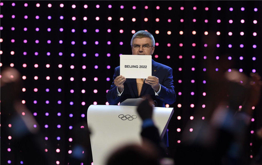 2015年7月31日,國際奧委會主席巴赫在國際奧委會第128次全會上宣布北京攜手張家口獲得2022年冬奧會舉辦權。新華社記者 公磊 攝
