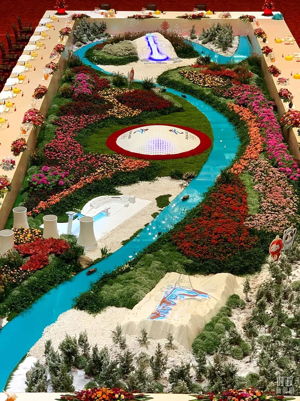 △餐桌上的“和平鴿”模型與前方的“冰墩墩”“雪容融”相映成趣。(總臺央視記者范一鳴拍攝)