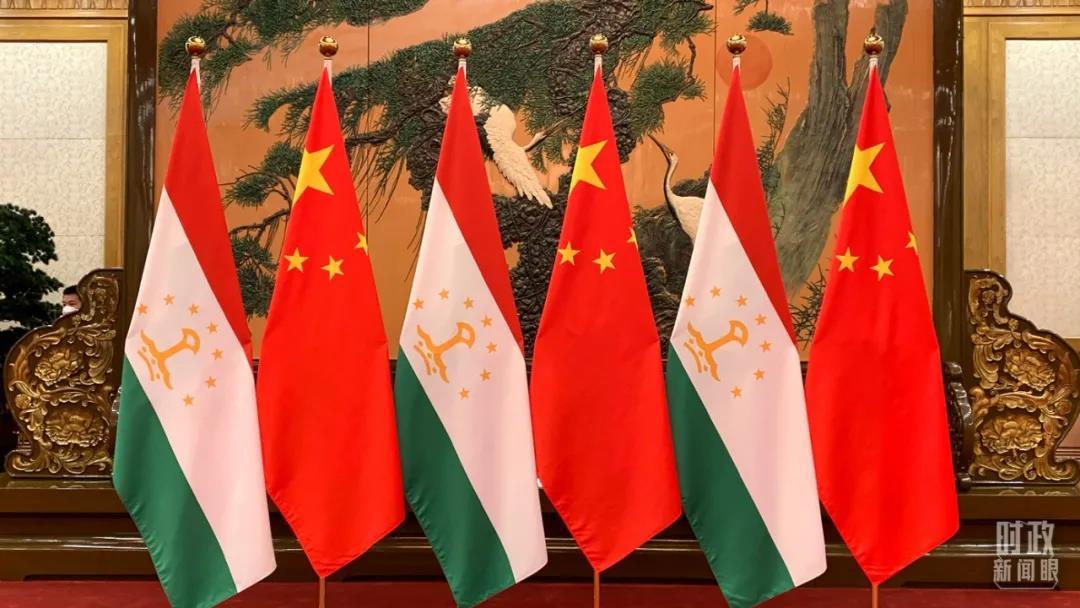 △塔吉克斯坦國旗與五星紅旗。(總臺央視記者段德文拍攝)