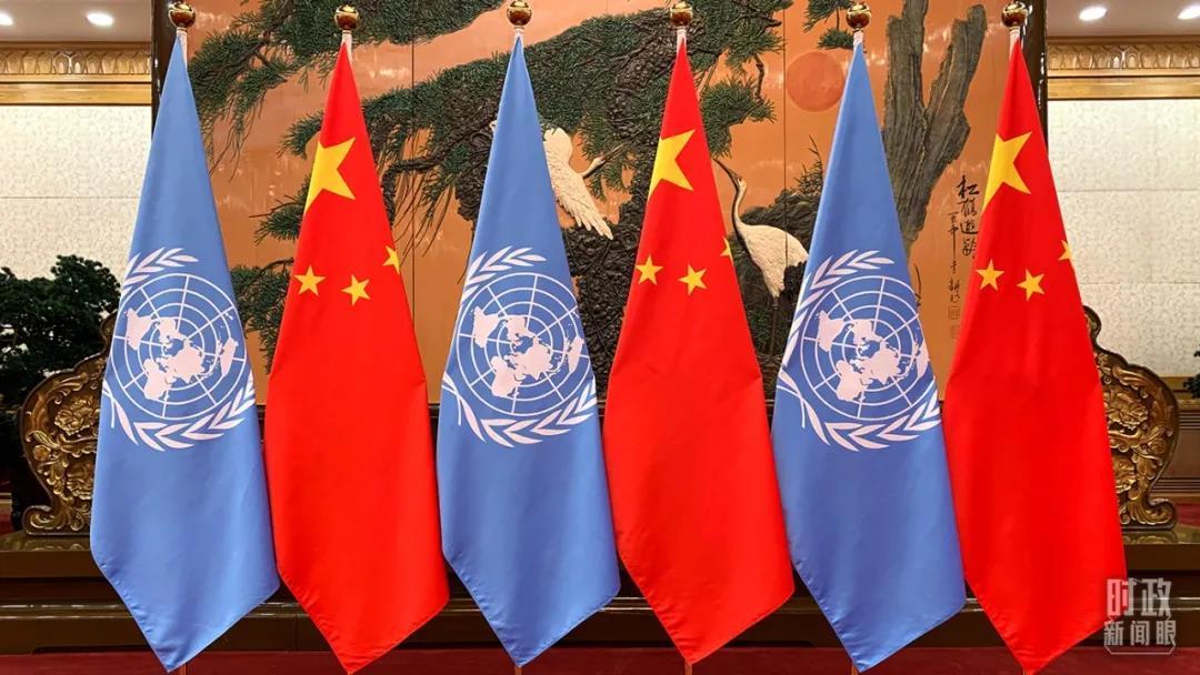 △會談現場的聯合國旗幟與五星紅旗。(總臺央視記者段德文拍攝)
