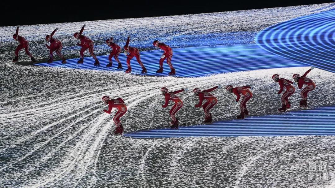 △開幕式上,滑冰運動員滑過冰面后,留下長長的軌跡。(總臺國廣記者李晉拍攝)