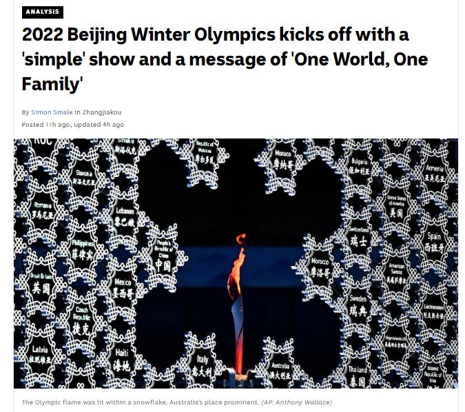 澳大利亞廣播公司(ABC)刊文稱(chēng),受疫情因素等影響, 2022北京冬奧會(huì)開(kāi)幕式持續(xù)了僅約兩個(gè)小時(shí),參與現(xiàn)場(chǎng)表演的約為3000人,而2008年奧運(yùn)會(huì)為15000人。而且,此次參與演出的大多數(shù)是普通人,而不是專(zhuān)業(yè)演員。5日的開(kāi)幕式雖與2008年那場(chǎng)驚艷世界的開(kāi)幕式風(fēng)格不同,但依然令人回味無(wú)窮,令人驚嘆的編舞和現(xiàn)場(chǎng)視覺(jué)效果尤其令人記憶深刻。但更令人印象深刻的是,此次開(kāi)幕式將 “世界一家”的思想貫穿始終,促使人們?nèi)リP(guān)注和思考奧運(yùn)會(huì)如何讓人們團(tuán)結(jié)在一起,這也正是奧林匹克運(yùn)動(dòng)的使命。在新冠疫情依然肆虐、世界分裂和對(duì)抗愈演愈烈的當(dāng)下,這顯得更加意義重大。