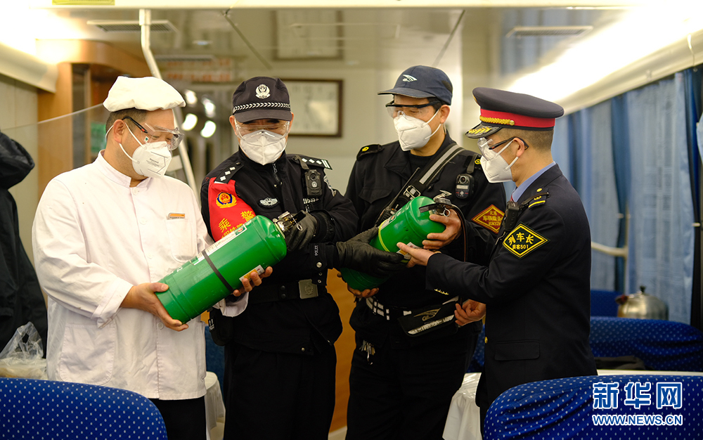 乘警蔣大兵與列車工作人員檢查消防器材。新華網發 賀瑞明攝