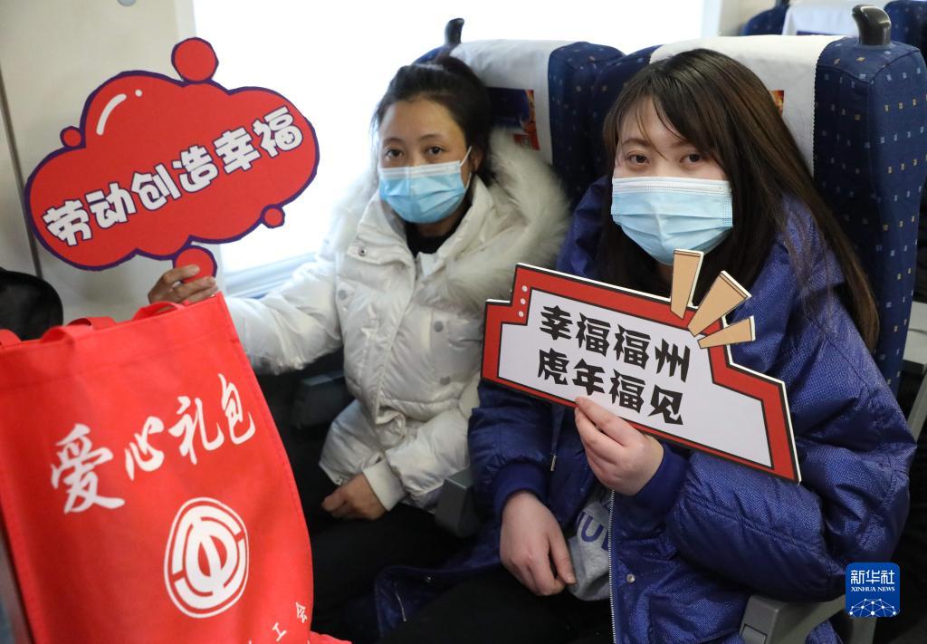2月9日,務(wù)工人員在蘭州西開(kāi)往福州的G1904次列車上。這是2022年閩隴兩省間開(kāi)行的首趟務(wù)工高鐵專列,載有540名來(lái)自甘肅定西的務(wù)工人員。