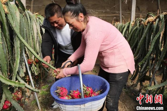 中新網(wǎng)烏魯木齊2月10日電 (江珊 石繼良 李萍 李雨浪)時下天氣乍暖還寒,新疆生產(chǎn)建設兵團第一師十一團七連靳紅軍的火龍果種植大棚內(nèi)卻暖意融融,一株株火龍果樹整齊排列,部分枝干上,一些熟透的紅心火龍果張開了“嘴”,顯得格外誘人。