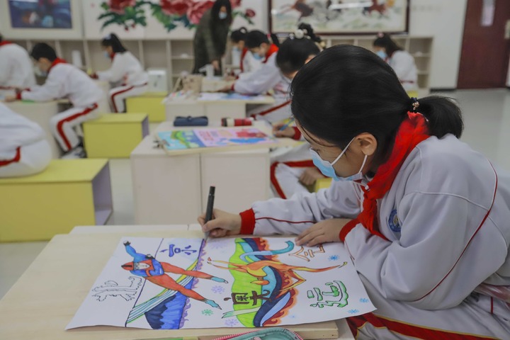 2021年11月17日,河北省唐山市路北區世嘉實驗小學的學生在進行迎冬奧主題繪畫作品創作。新華社記者劉滿倉攝