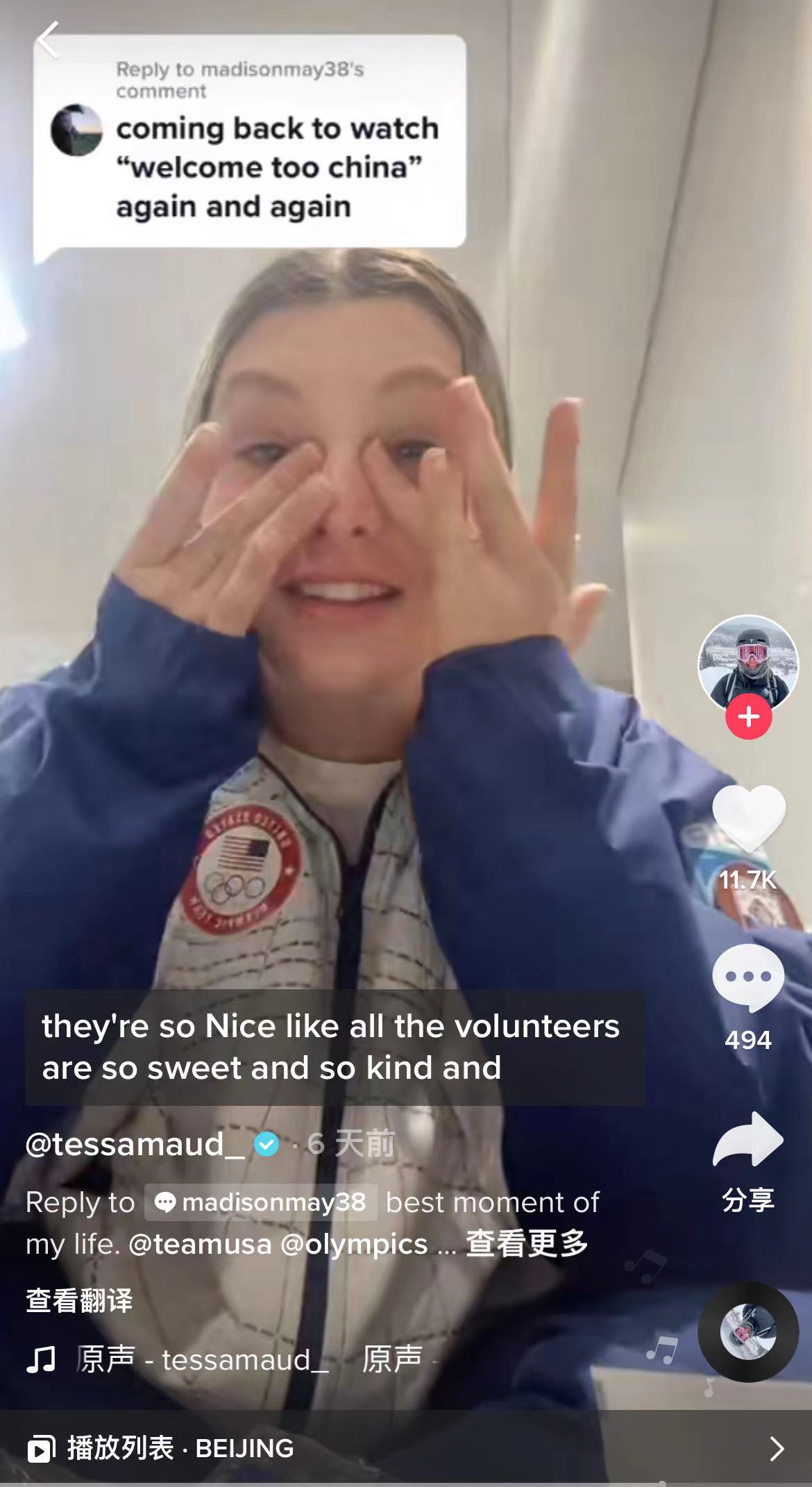 美國運動員特莎分享在中國的最后一天 說著說著又哭了