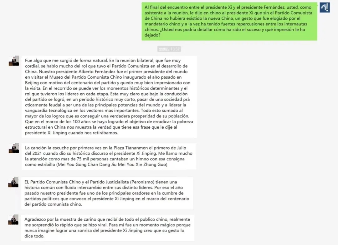 在與習近平主席的會晤中,他們討論了阿根廷的庇隆主義與中國共產黨的共性:堅持以人民為中心的發展思想;同時也強調了在中阿建交五十周年之際進一步加強雙邊關系。我們(正義)黨在對華關系問題上具有戰略眼光,并仍在逐步深入。