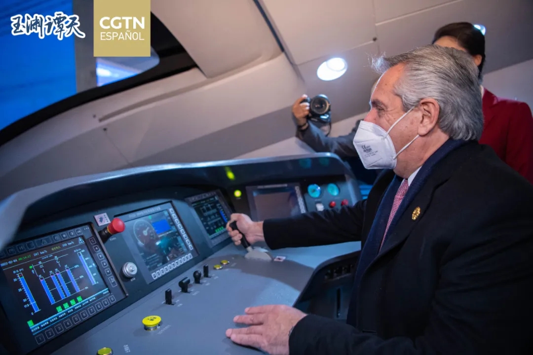 ▲阿根廷總統費爾南德斯在中國共產黨歷史展覽館體驗中國高鐵駕駛模型