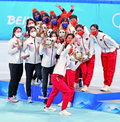 2月13日,北京2022年冬奧會短道速滑項目女子3000米接力決賽中,中國隊獲得季軍。圖為冠軍亞軍季軍選手在頒發紀念品儀式上手握冰墩墩合照自拍。