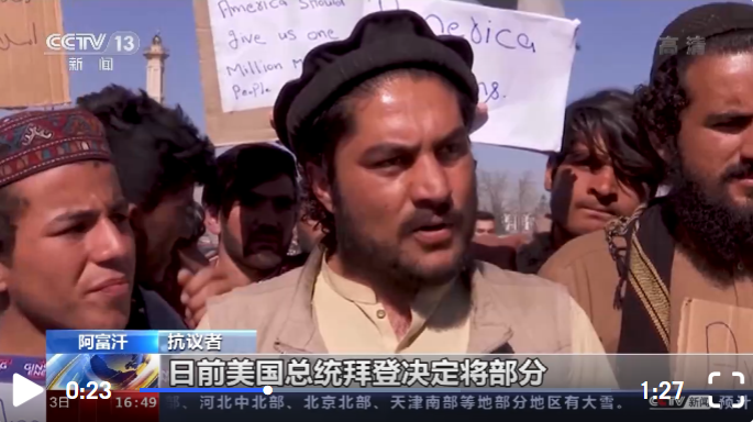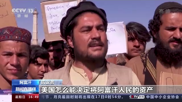 阿富汗抗議者:日前,美國總統(tǒng)拜登決定將部分被凍結(jié)的阿富汗資產(chǎn)分配給“9·11”事件受害者,因此我們在這里抗議。我們要問國際社會,美國怎么能決定將阿富汗人民的資產(chǎn)用于(賠償)“9·11”事件受害者?抗議將出現(xiàn)在阿富汗每個省份,作為一名阿富汗青年,我呼吁阿富汗人民站出來抗議,捍衛(wèi)自己的權(quán)利。