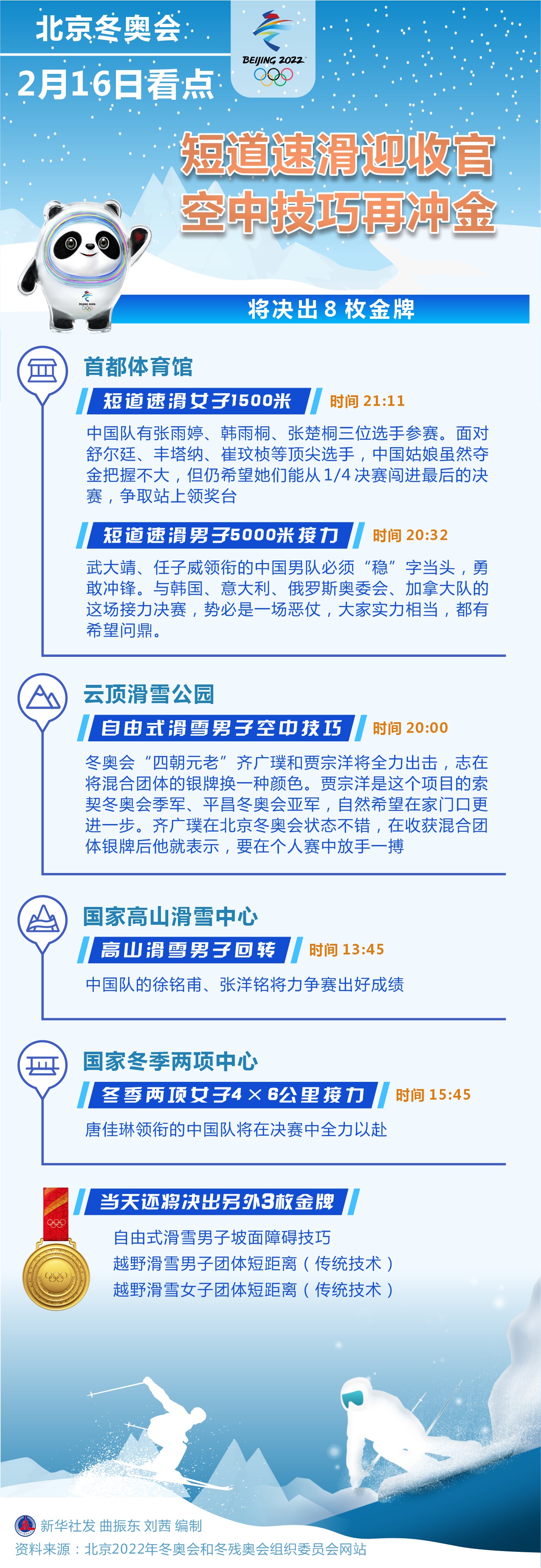 新華社北京2月15日電(記者張澤偉、王恒志)北京冬奧會16日將決出8枚金牌,其中短道速滑進入最后一個比賽日,將產生男子5000米接力和女子1500米兩枚金牌,期待中國健兒出色發揮、完美收官。另外,齊廣璞、賈宗洋兩位“四朝元老”將在自由式滑雪男子空中技巧項目全力沖金。