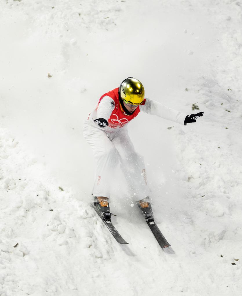 2月15日,中國選手齊廣璞在北京冬奧會自由式滑雪男子空中技巧資格賽中。新華社記者費茂華攝