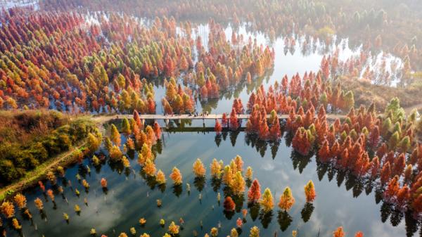 2021年12月10日拍攝的云南省昆明市的甸尾村水杉濕地一景(無人機照片)。新華社記者 胡超 攝