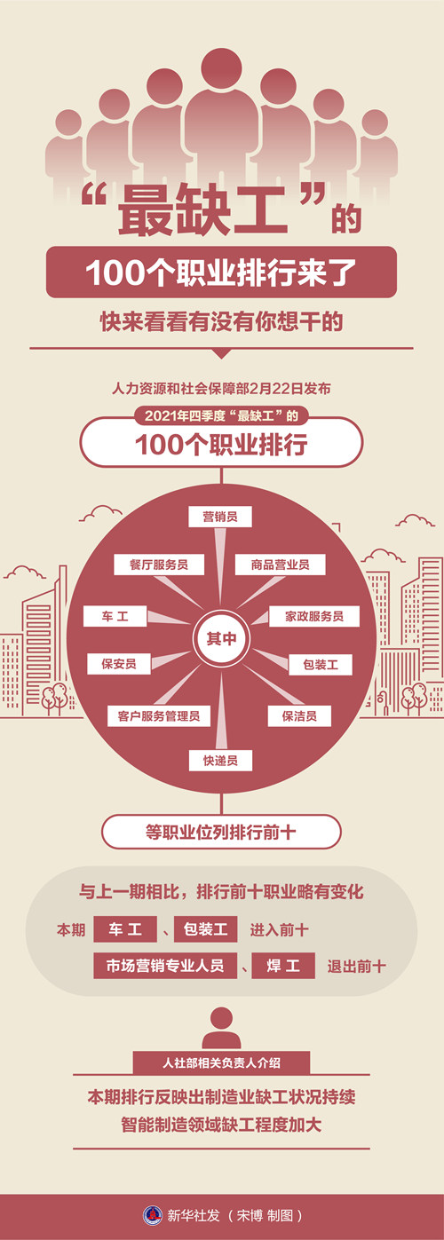 新華社北京2月22日電(記者馮家順、姜琳)人力資源和社會保障部22日發布2021年四季度“最缺工”的100個職業排行,其中,營銷員、餐廳服務員、商品營業員、車工、家政服務員、保安員、包裝工、客戶服務管理員、保潔員、快遞員等職業位列排行前十。