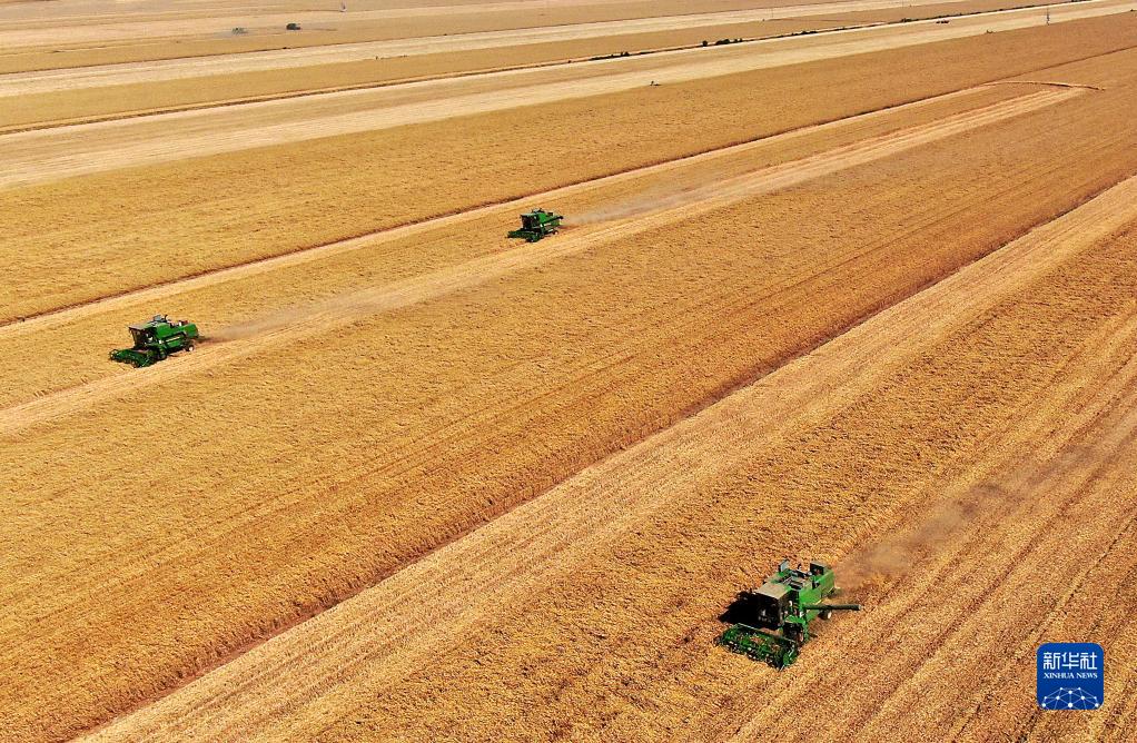 在河南省黃泛區(qū)農(nóng)場九分場的麥田里,農(nóng)機(jī)手操作收割機(jī)收獲小麥(無人機(jī)照片,2021年6月6日攝)。新華社記者 李安 攝