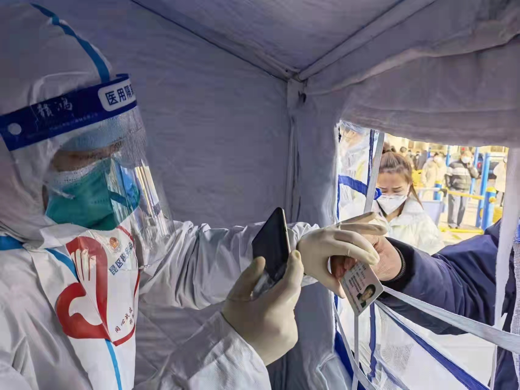 2月20日,內(nèi)蒙古包頭市疫情防控志愿者為做核酸檢測(cè)的居民錄入信息。(受訪者供圖)