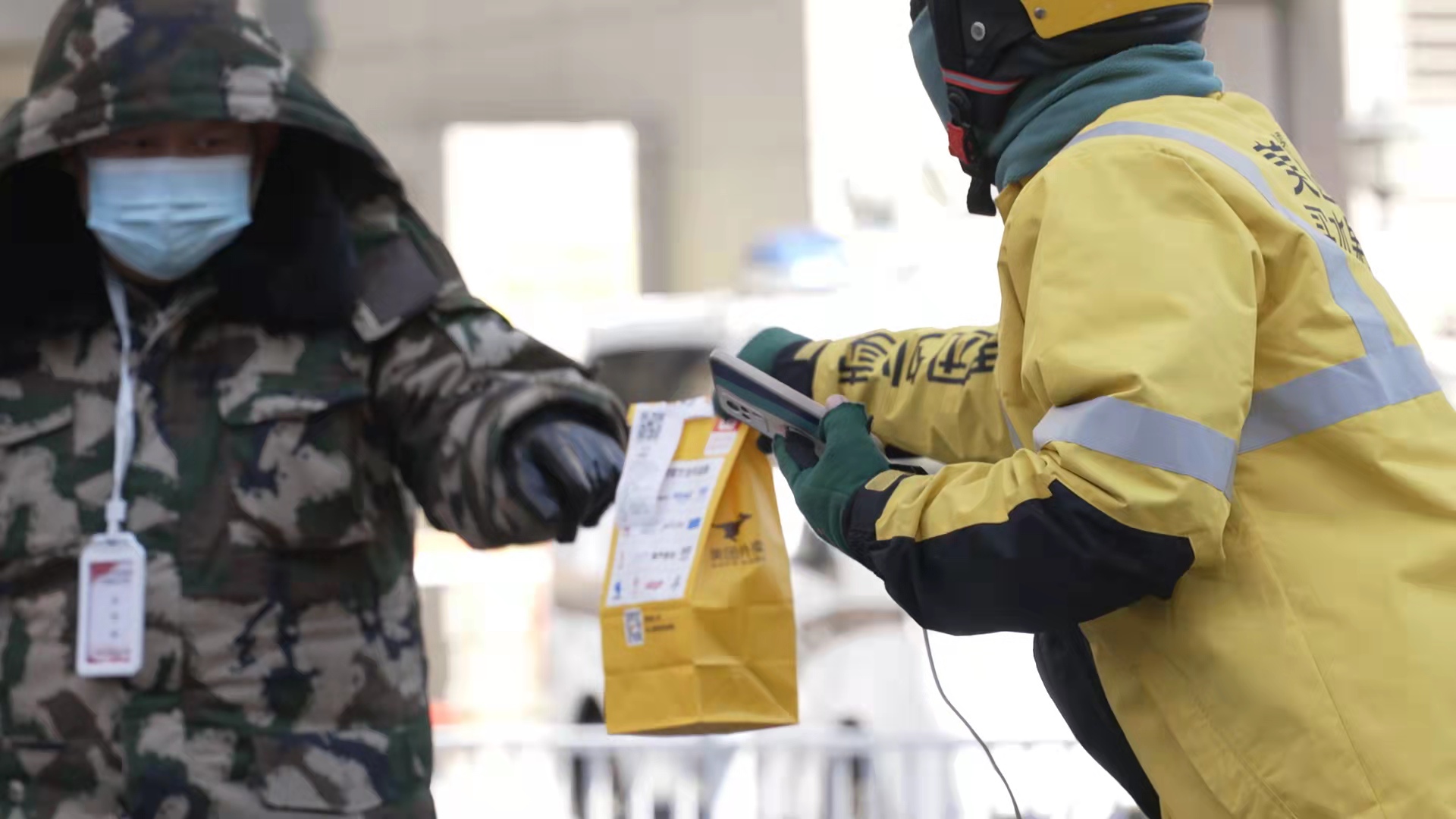 2月20日,內(nèi)蒙古呼和浩特市的外賣騎手將餐食交給疫情防控工作者。新華社記者達(dá)日罕 攝