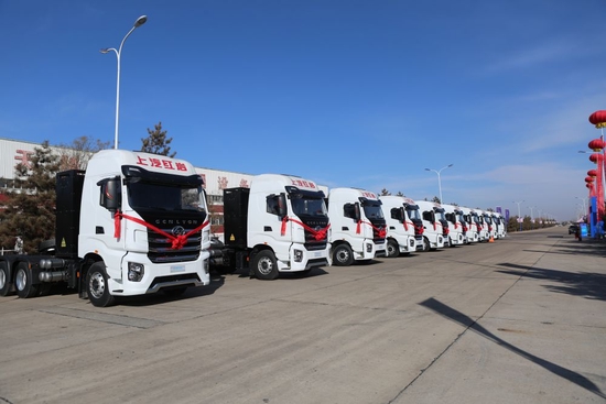 上汽紅巖鄂爾多斯基地天隆工廠的首批投產車輛。(受訪者供圖)