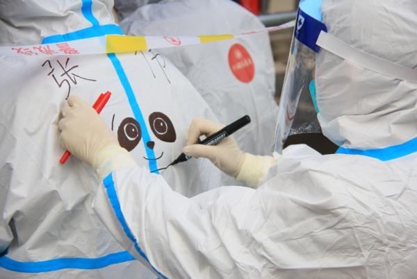 來自鎮江的醫務人員王艷閑暇時喜歡畫畫,采樣開始前,她發揮特長,為“戰友”們繪就一幅幅活靈活現的“大白圖騰”,為緊張的采樣工作帶來了別樣歡樂。