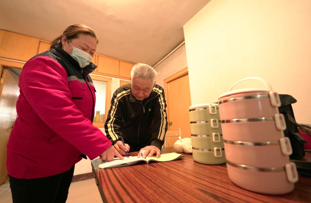 河北省邢臺市康寧智慧社區養老服務中心工作人員(左)把午餐送到檀成海老人家中(2022年1月6日)。新華社發 (陳雷 攝)