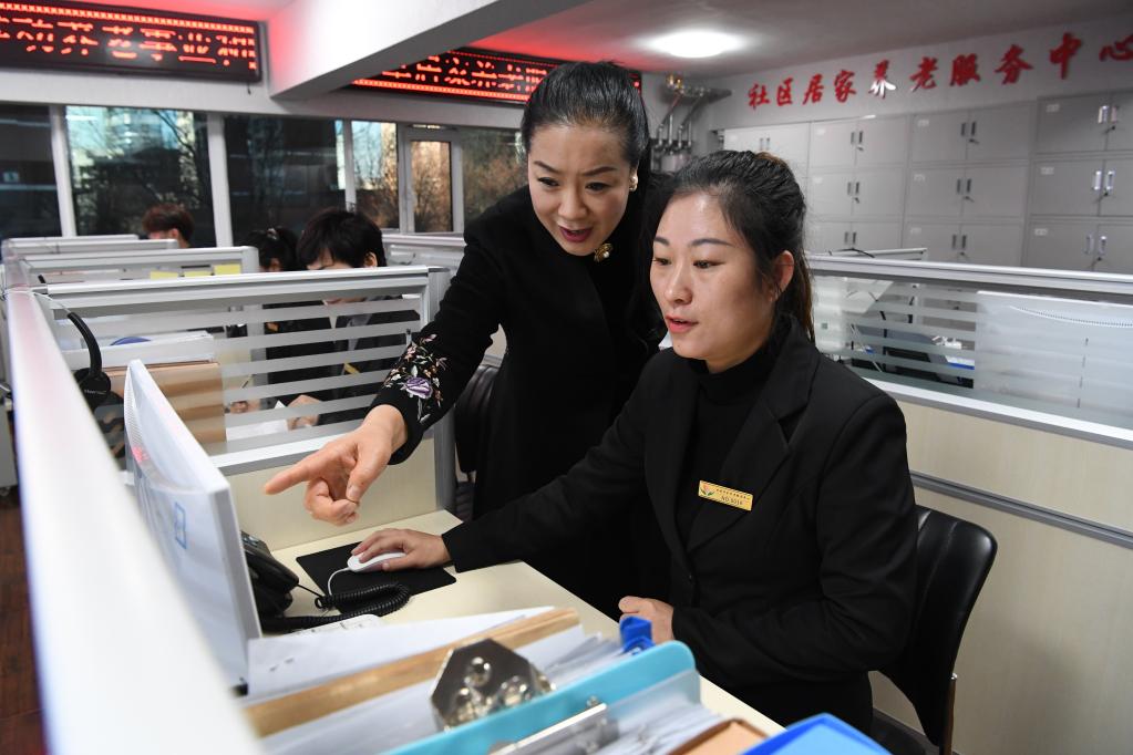 河北省承德市愛孝居家養老服務中心工作人員在濱河社區智慧服務平臺工作(2021年12月16日攝)。新華社記者 朱旭東攝