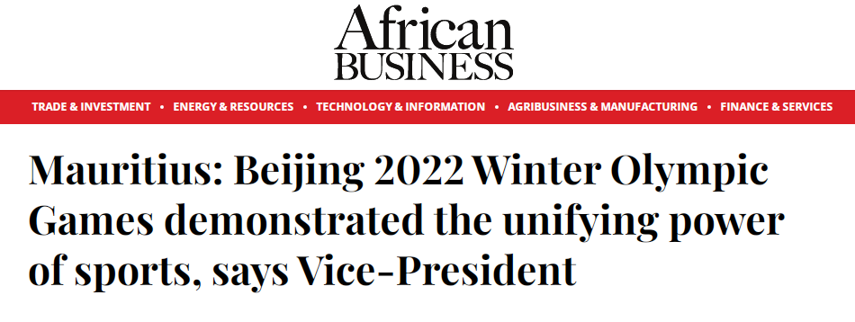 據非洲商業媒體African Business報道,為祝賀北京冬奧會勝利閉幕,當地時間2月21日,由毛里求斯新唐人街基金會(New China Foundation)舉辦的主題活動在當地舉行。與會嘉賓一致認為,中國克服新冠疫情帶來的諸多困難,高質量舉辦冬奧會,讓全世界人民見證了中國和奧林匹克運動的魅力,也用實際行動展示了中國在促進團結與合作中所做出的努力,為世界各國樹立了典范。
