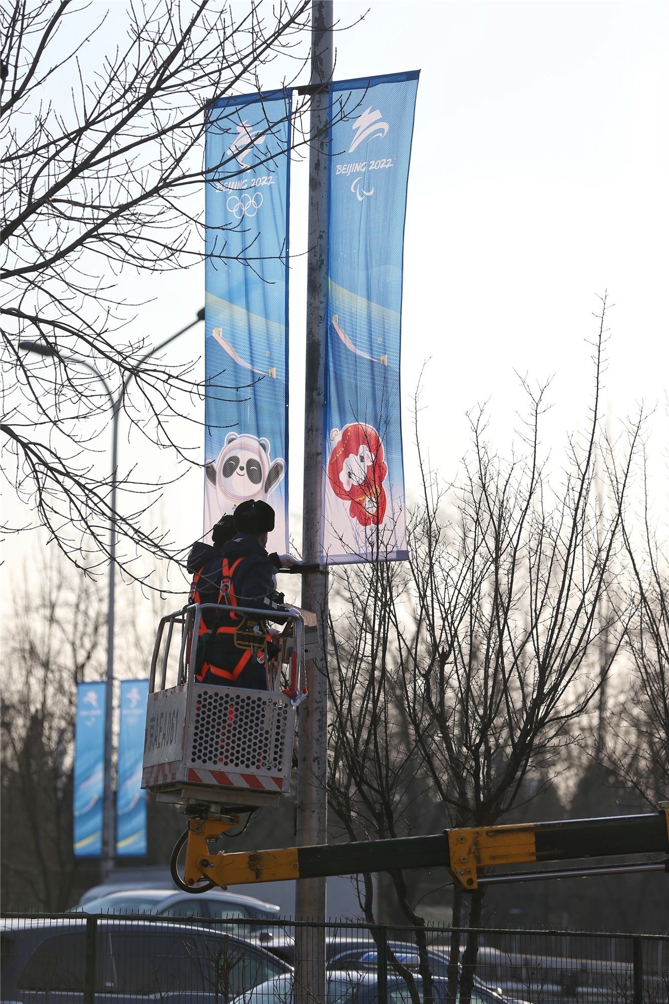 2月24日,北京北四環,工作人員摘下冬奧會的紅色道旗,更換為冬殘奧會使用的藍色道旗。