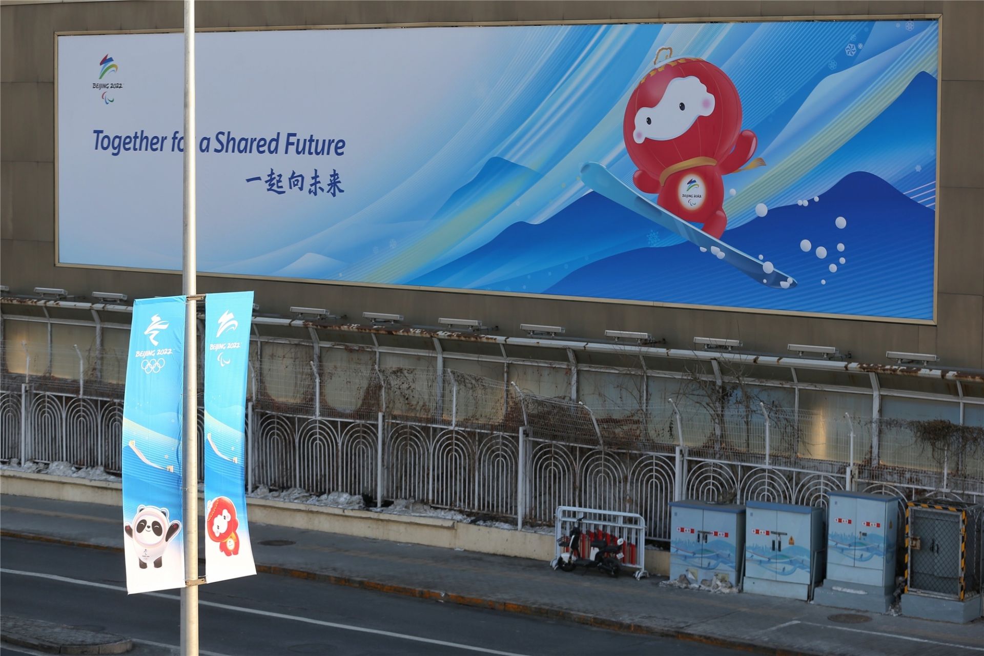 2月24日,北京相關道路景觀已更換為冬殘奧會標志、吉祥物等。