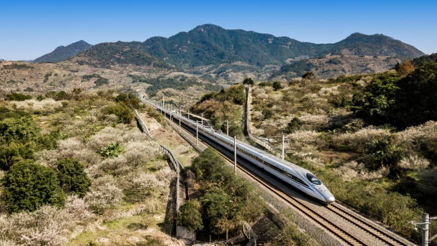 春運首日,動車穿越梅花林