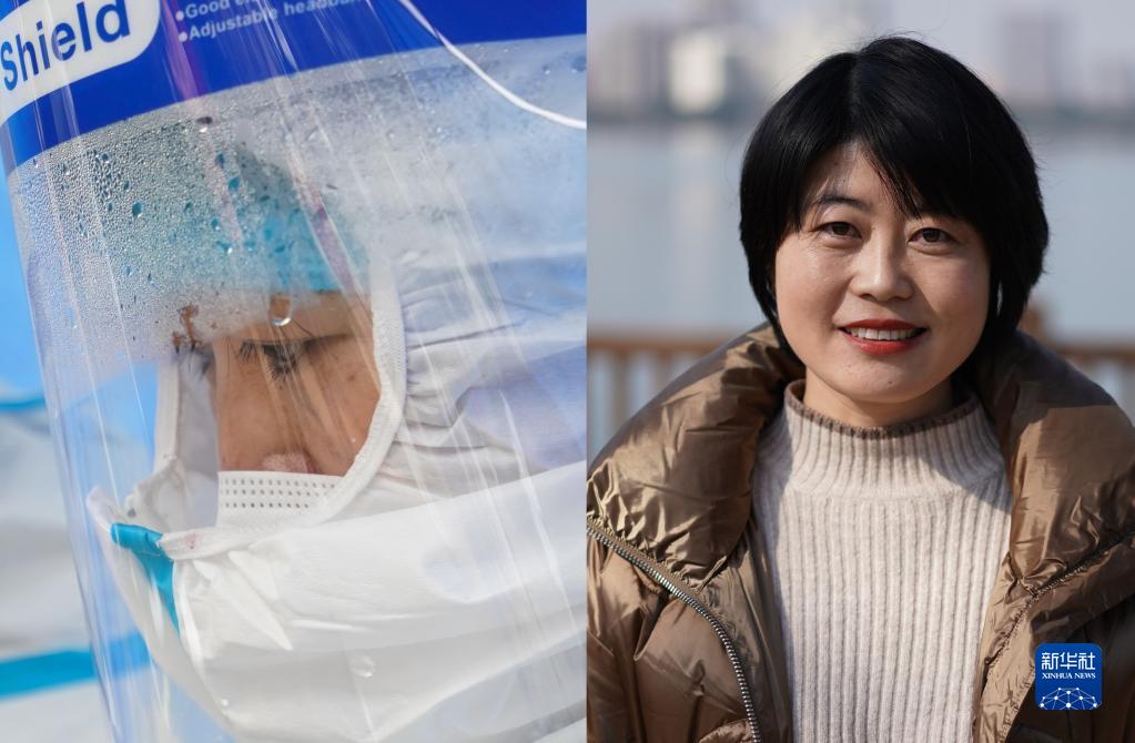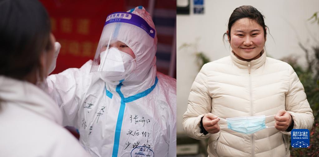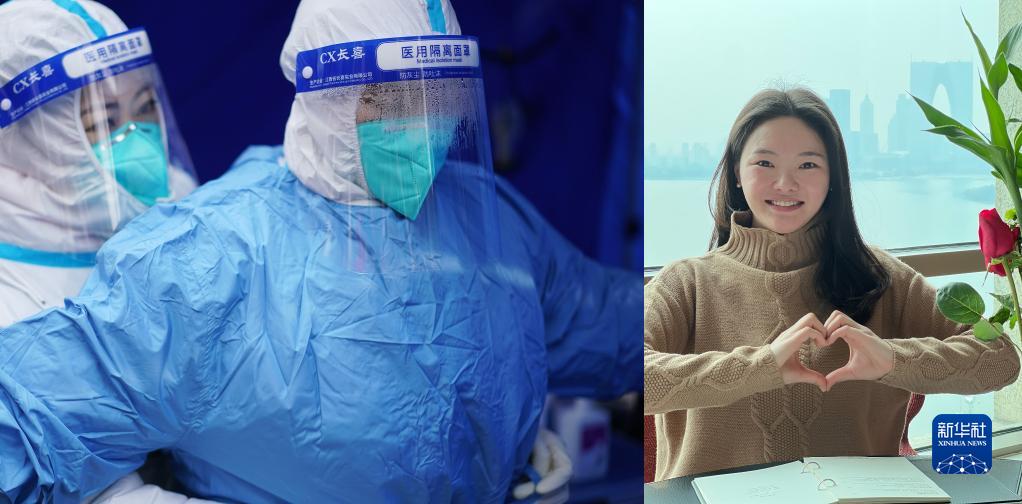 拼版照片:左圖為在蘇州工業園區西湖社區青湖麗苑小區核酸采樣點,護士朱明星(前)穿上隔離服,準備上門進行核酸采樣(2月22日新華社記者季春鵬攝);右圖為朱明星在酒店房間為蘇州人民和抗疫人員“比心加油”(2月22日攝,受訪者提供)。朱明星2008年經歷過汶川大地震,她說,“我想盡自己的綿薄之力,報答社會。我一個人是微不足道的,但是大家齊心協力,點點星火定將匯聚成必勝光芒。”朱明星說。蘇州本輪疫情發生以來,廣大醫護人員、社區工作人員、志愿者堅守崗位,不舍晝夜,奮戰在抗疫一線,與病毒較量,與時間賽跑,匯聚成抗擊疫情的磅礴力量。新華社發