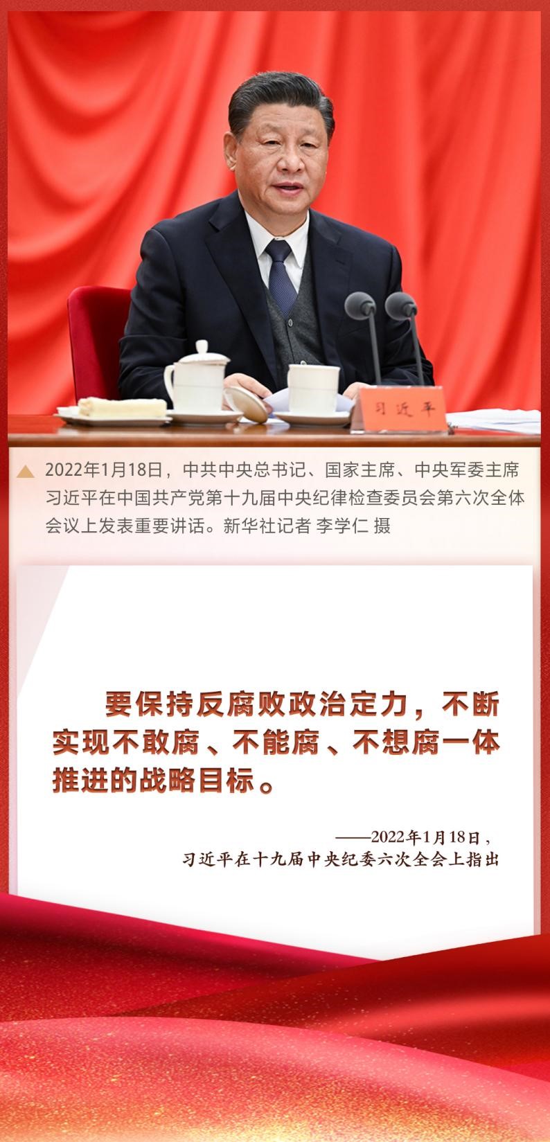 “要保持反腐敗政治定力,不斷實(shí)現(xiàn)不敢腐、不能腐、不想腐一體推進(jìn)的戰(zhàn)略目標(biāo)。”中共中央總書記、國(guó)家主席、中央軍委主席習(xí)近平在十九屆中央紀(jì)委六次全會(huì)上發(fā)表重要講話,深刻總結(jié)新時(shí)代黨的自我革命的成功實(shí)踐,深刻闡述全面從嚴(yán)治黨取得的歷史性、開創(chuàng)性成就,產(chǎn)生的全方位、深層次影響,對(duì)堅(jiān)持不懈把全面從嚴(yán)治黨向縱深推進(jìn)、迎接黨的二十大勝利召開作出戰(zhàn)略部署。