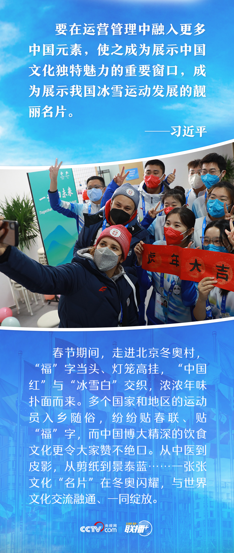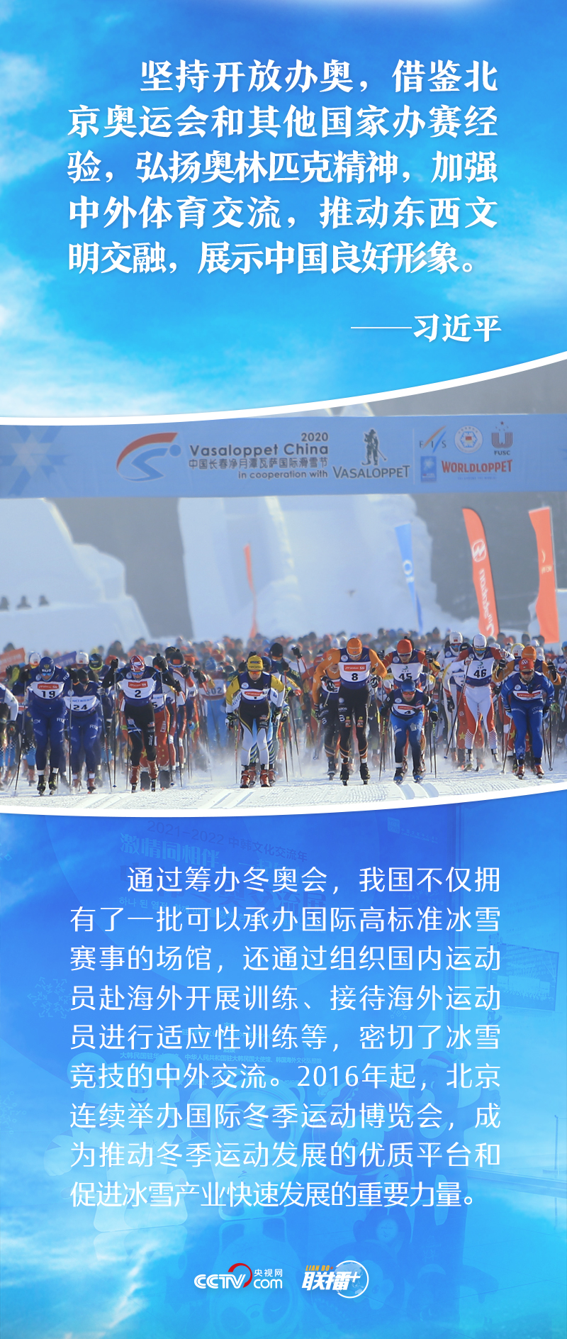 聯(lián)播+“成功舉辦北京冬奧會、冬殘奧會,不僅可以增強我們實現(xiàn)中華民族偉大復(fù)興的信心,而且有利于展示我們國家和民族致力于推動構(gòu)建人類命運共同體,陽光、富強、開放的良好形象,增進(jìn)各國人民對中國的了解和認(rèn)識。”新年伊始,習(xí)近平總書記在北京考察2022年冬奧會、冬殘奧會籌辦備賽工作時這樣強調(diào)。