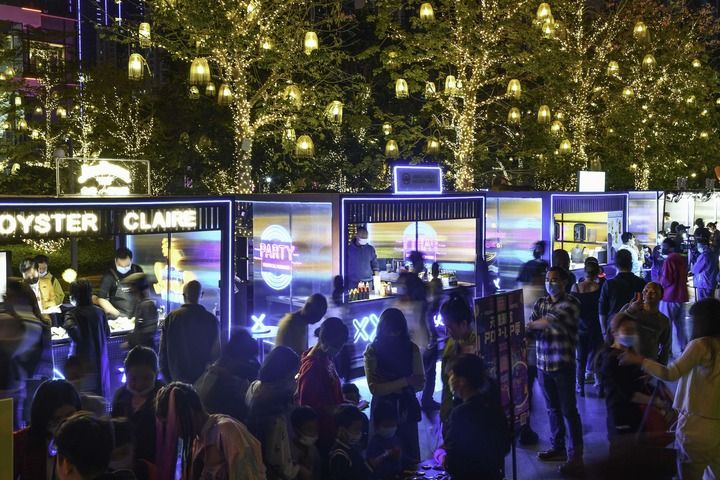 市民在廣州夜經濟集聚區天德廣場天德快閃街品嘗美食(2021年12月10日攝)。新華社記者 劉大偉 攝