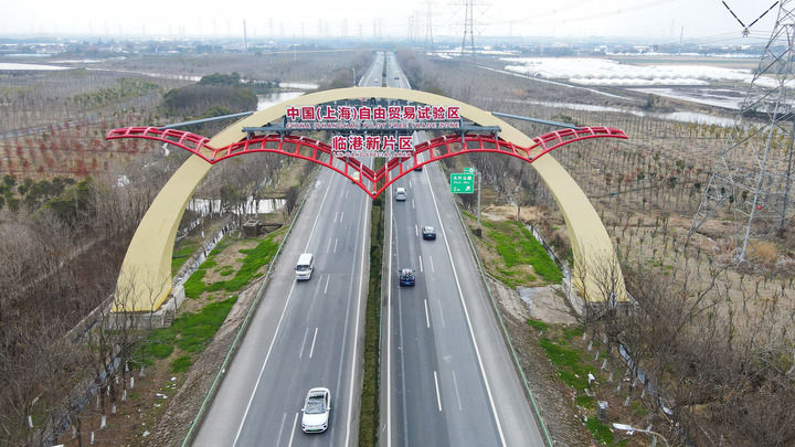 S2滬蘆高速上的中國(上海)自由貿易試驗區臨港新片區“海鷗門”(2022年2月10日攝,無人機照片)。新華社記者 方喆 攝