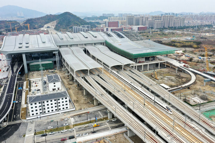 從浙江嵊州新昌站開出的杭臺高鐵首發列車停靠臺州站后駛出,開往溫嶺方向(2022年1月8日攝,無人機照片)。新華社記者 黃宗治 攝