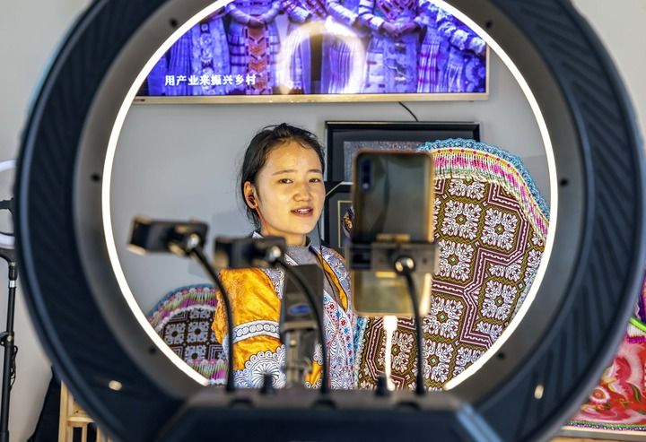 幾千公里外,貴州畢節,“懸崖下的村寨”化屋村里,青春靚麗的“阿哥阿姐”借助電商直播,讓特色苗繡源源不斷飛出深山,走向全國。