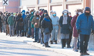 近期,加拿大疫情仍在持續蔓延。圖為1月14日,在加拿大安大略省多倫多,人們排隊領取免費發放的新冠病毒檢測套裝。