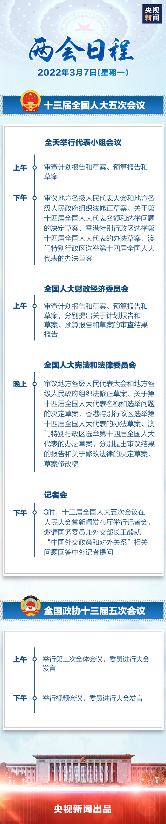 原標題:兩會日程丨3月7日:人代會審查計劃、預算報告 審議地方組織法修正草案 政協委員進行大會發言